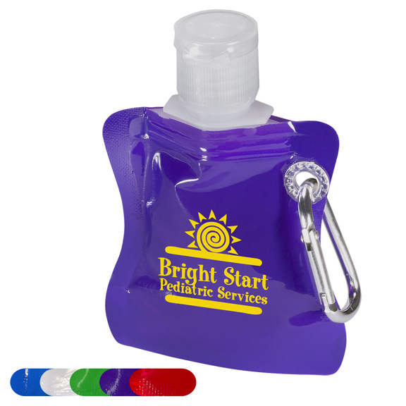 • 1 oz hand sanitizer on handy carabiner clip. On the go anti bacterial gel in a convenient polyethylene collaspible container. Effective at eliminating 99.9 percent of germs and bacteria.