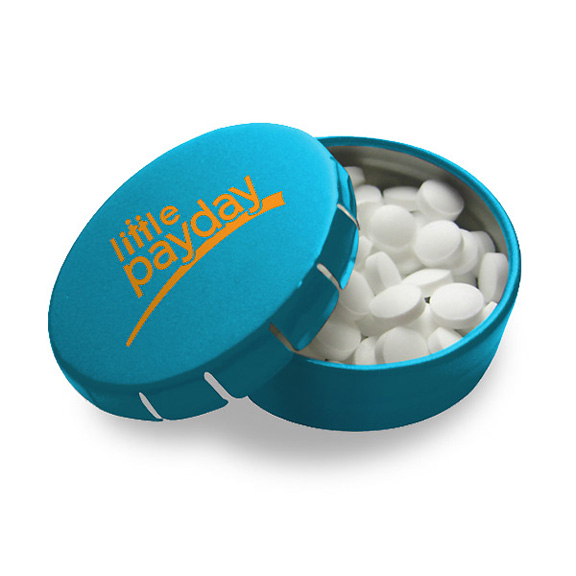 • Round Tek Click metal tin clicks / pops open and closed. Includes approximately .5 oz. of sugar free mints. Rush not available on clear or metallic labels.