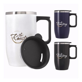 • The perfect on-the-go travel mug. Great handle makes it convenient to carry. Double-wall vacuum insulation Push-on, spill-resistant drink-thru lid Easy to take on-the-go 14 oz. capacity when filled to the rim