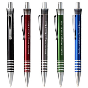 • Click action Ballpoint. Rings at the base of the barrel and top give a rich distinctive look to the pen. The clip has a cut-out that gives an added touch of elegance.